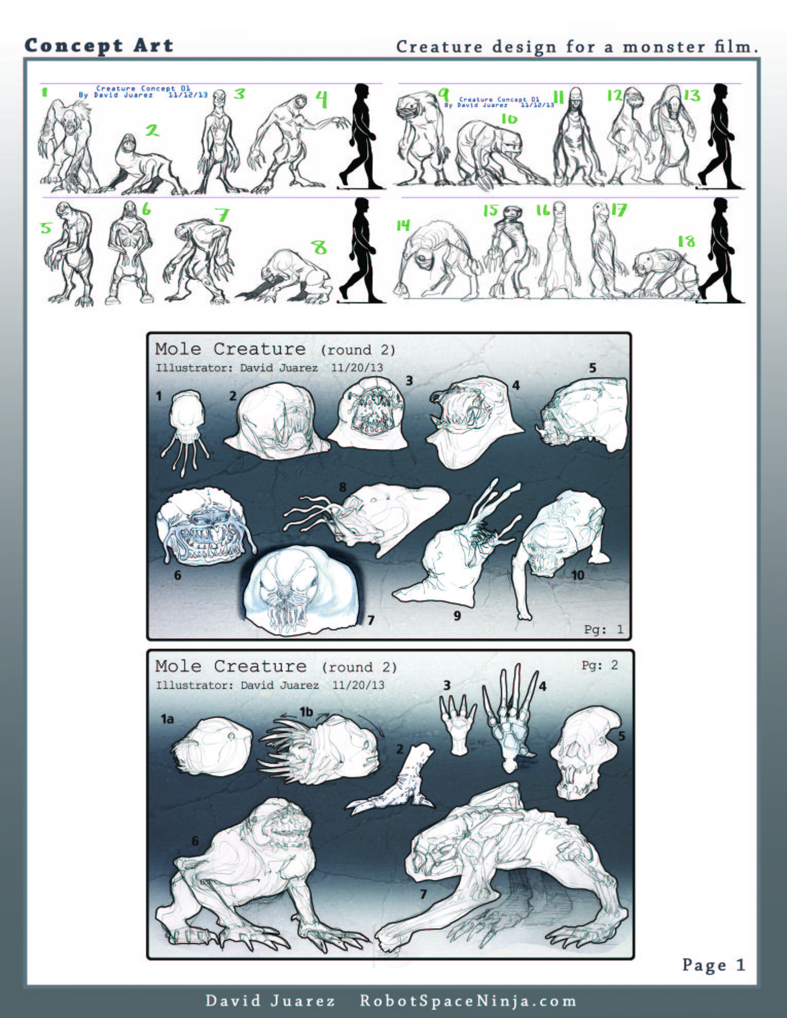 You can see the different body types we looked at. I included different drawings of how the creatures body works, even a look at it’s skeleton. Part of the movie was that these creatures can sit up and kind of look like human silhouettes which made their hunting easier. Very cool concept. I think they’re still pitching it around.